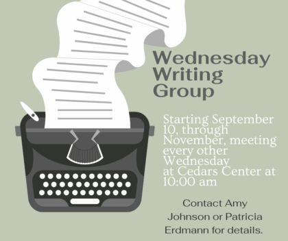 We plan to meet at the Cedars Center at 10 am every other Wednesday.